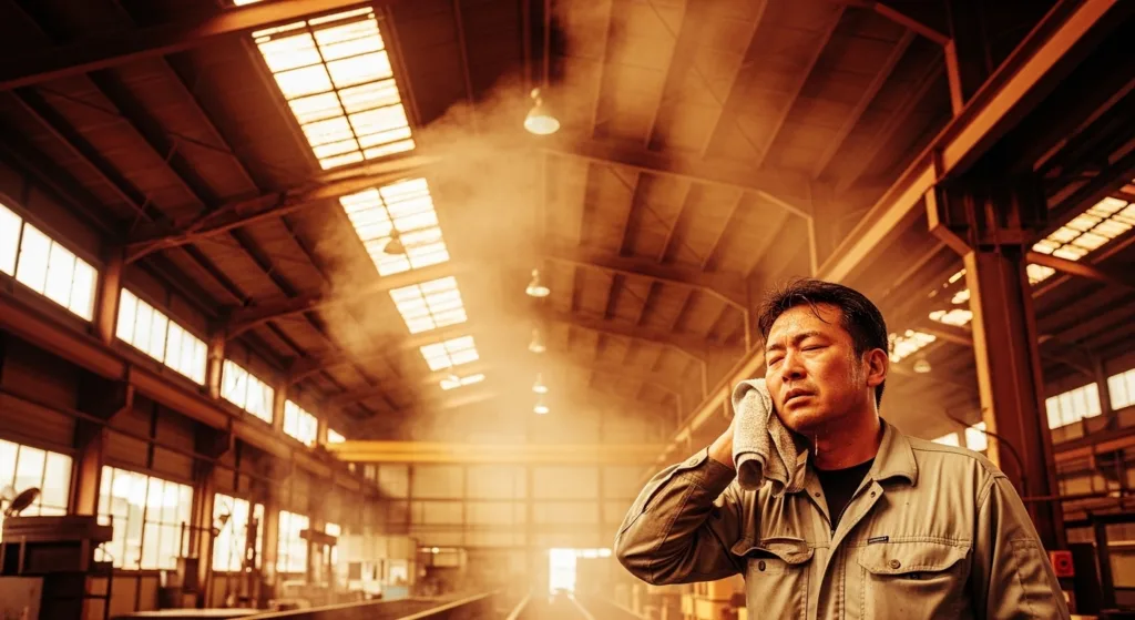 ある調査では、工場作業者の約48.6%が「職場で熱中症になった人がいる」と回答しており、さらに47.7%が「工場の暑さ対策に不満がある」と答えています。つまり、およそ半数の現場スタッフが暑さに不満を抱えている状況です。